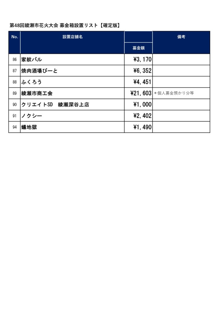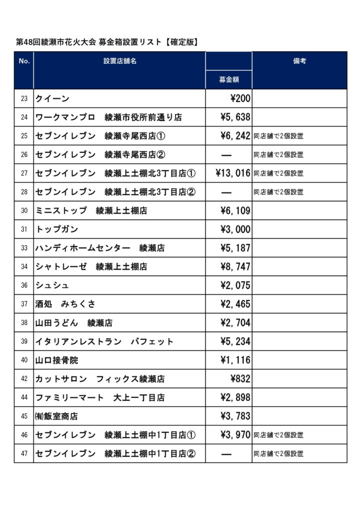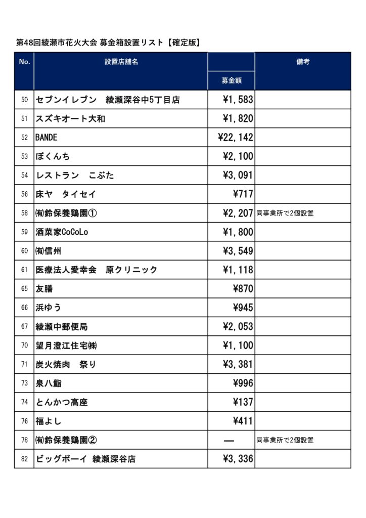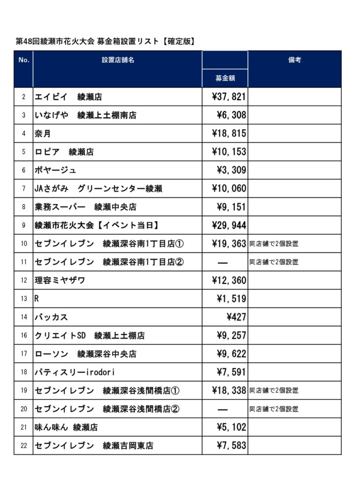 募金箱設置のご協力並びに花火大会への募金のご協力ありがとうございました。